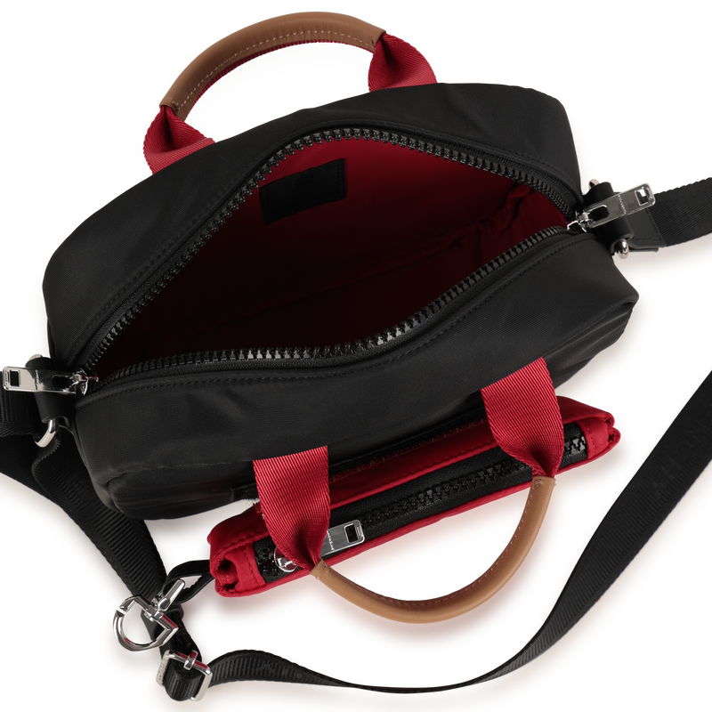 Combining luxury and practicality, this GIVENCHY dual-material textile and leather shoulder bag offers a modern and refined style. The adjustable strap, adorned with the GIVENCHY print, and the leather details add character to this model. The removable pouch with GIVENCHY print and removable badges add a personalized touch, while the transparent window with name tag on the back adds additional functionality. Contains non-textile parts of animal origin.