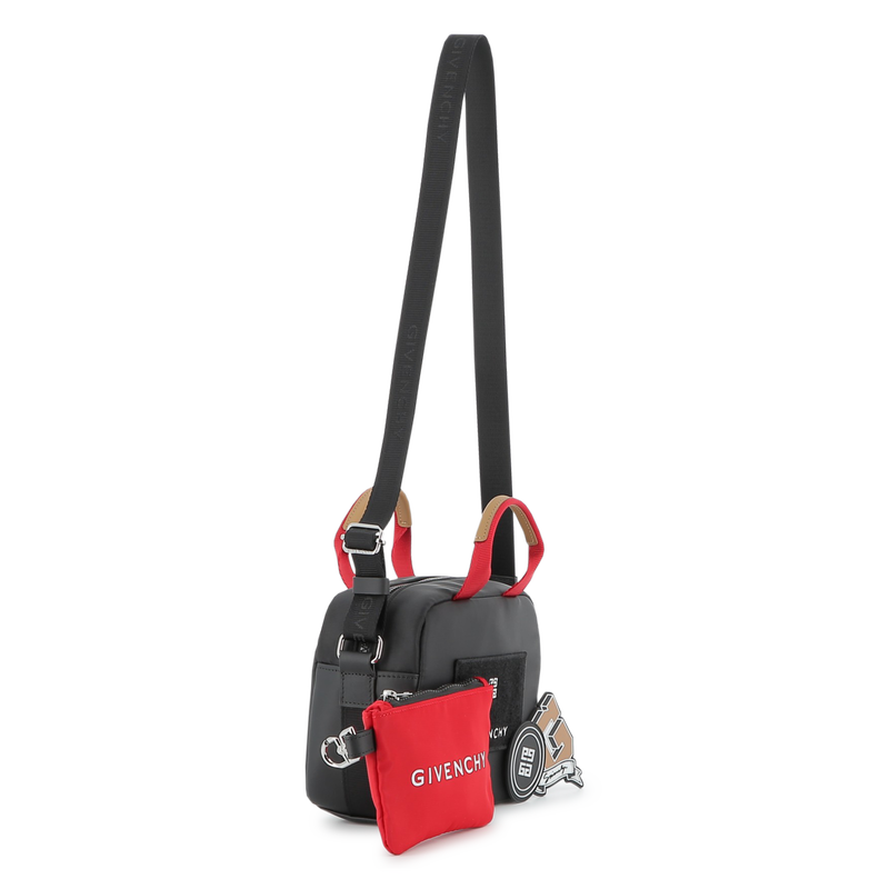 Combining luxury and practicality, this GIVENCHY dual-material textile and leather shoulder bag offers a modern and refined style. The adjustable strap, adorned with the GIVENCHY print, and the leather details add character to this model. The removable pouch with GIVENCHY print and removable badges add a personalized touch, while the transparent window with name tag on the back adds additional functionality. Contains non-textile parts of animal origin.