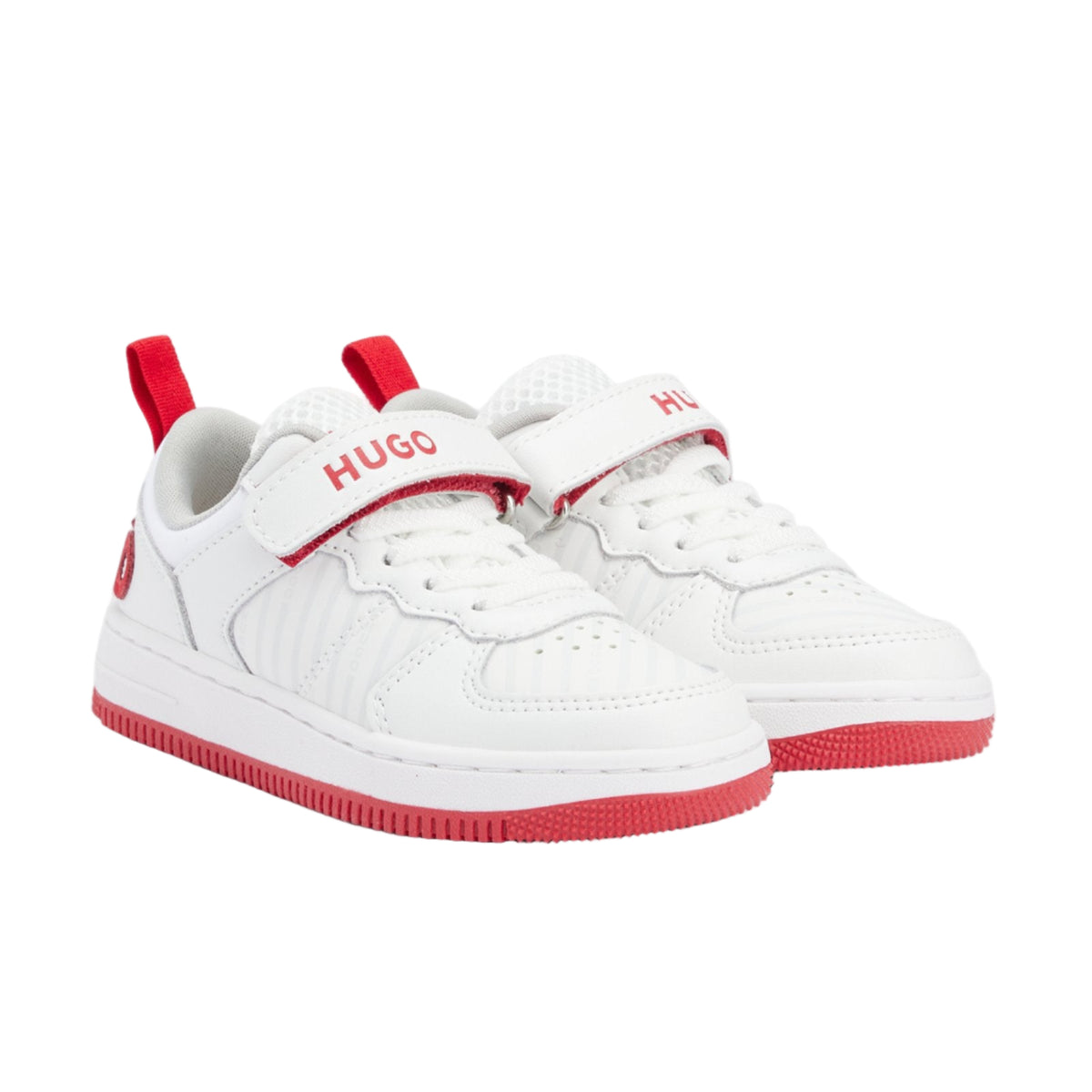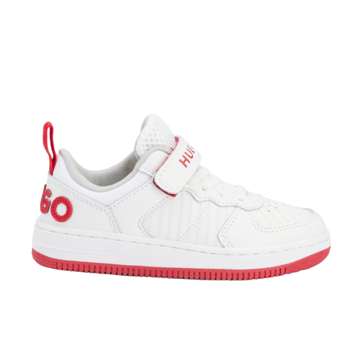 The Hugo sneaker for kids combines a modern design with functionality. Crafted from synthetic coated textile—a material that mimics genuine leather with various finishes—and breathable mesh, these sporty shoes include a branded hook-and-loop strap for a secure fit.