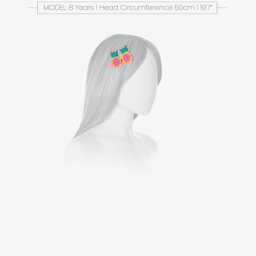 Bright and glittery, a shaped hair clip for girls by Billieblush, in a fun pineapple sunglasses design. Ideal as a cute finishing touch to an outfit, it has a metal clip fastening on the back, covered in pink grosgrain ribbon.