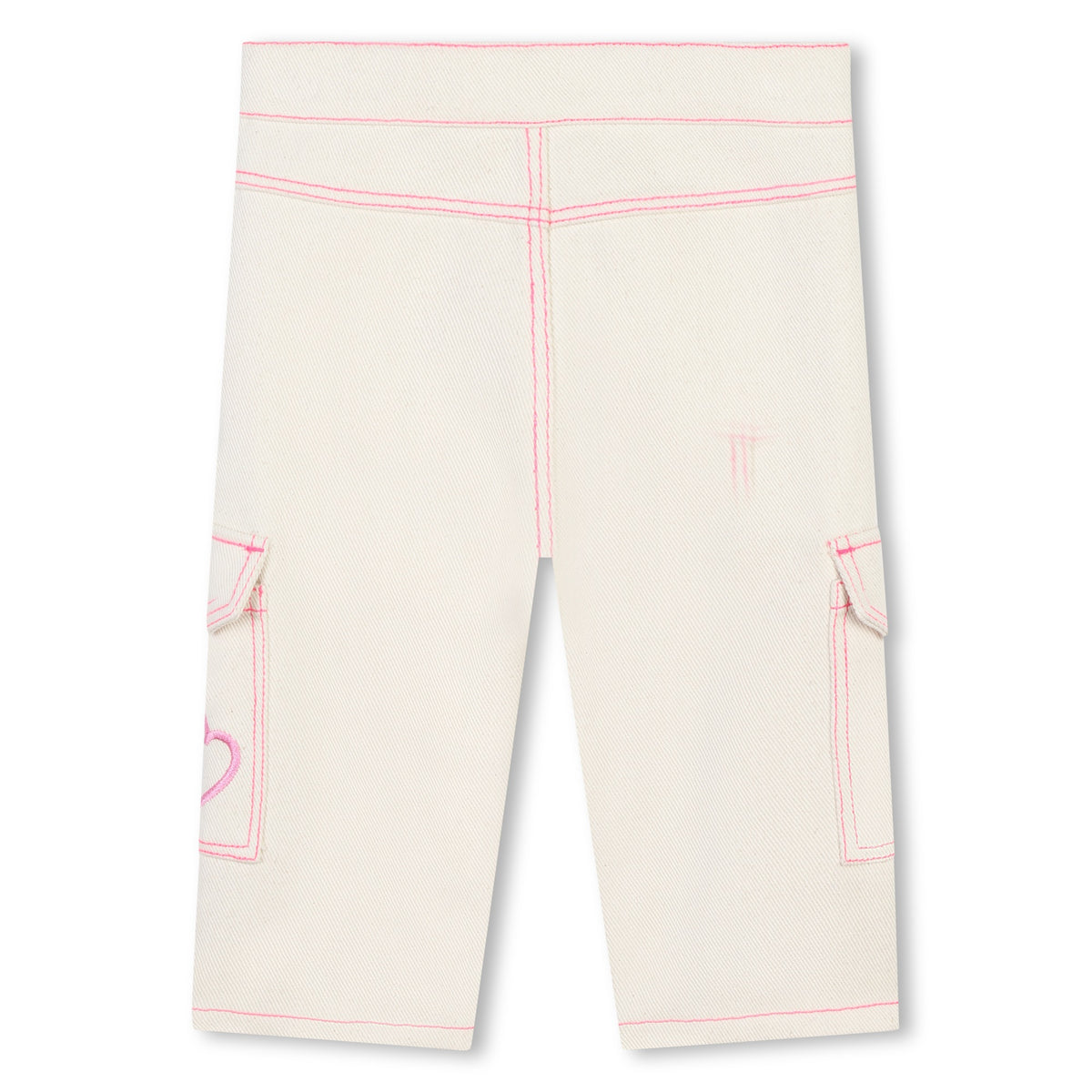 Billieblush cargo pants feature side pockets with flaps and close with a front snap button. They are decorated with embroidered hearts on one of the pockets and contrasting stitching. The 100% cotton garment has an elasticated waist.