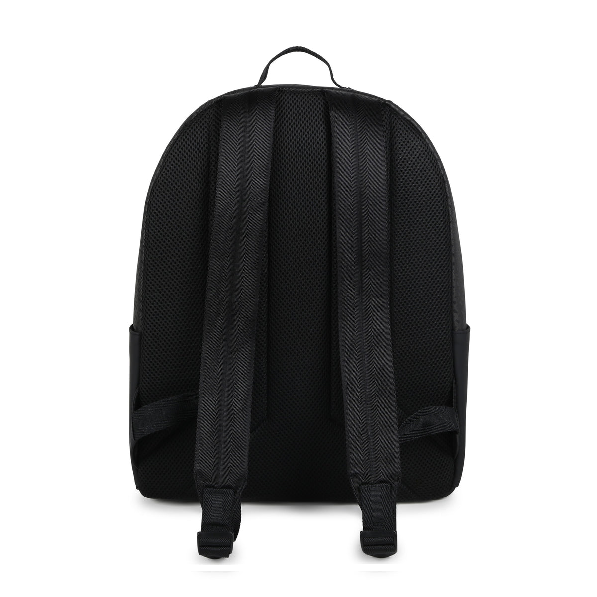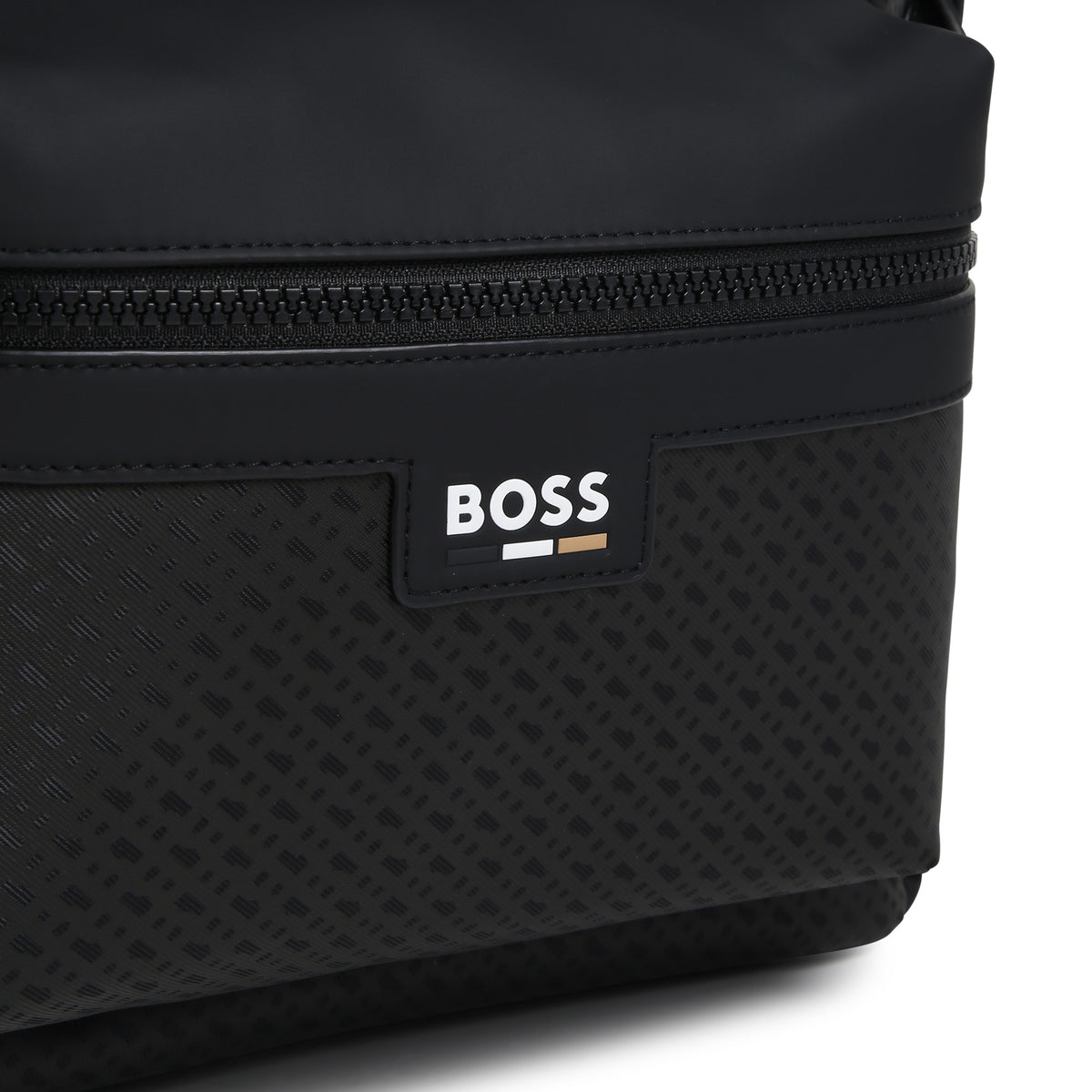 This practical and stylish BOSS backpack showcases an allover 'B' monogram print with rubber-effect panels. It offers padded mesh on the back and inside the straps for enhanced comfort. Dimensions: approximately 11.8 x 15.2 x 4.7 inches.