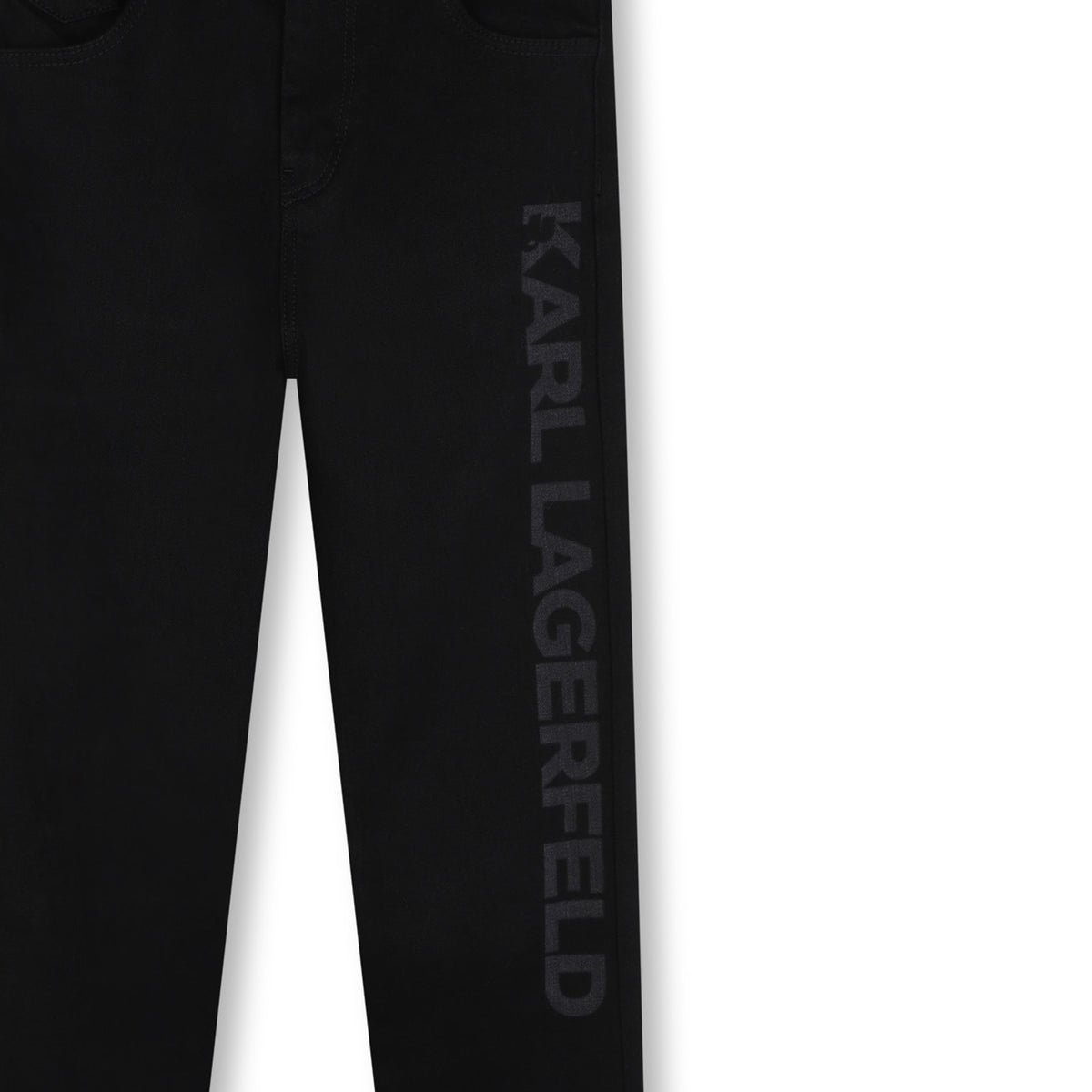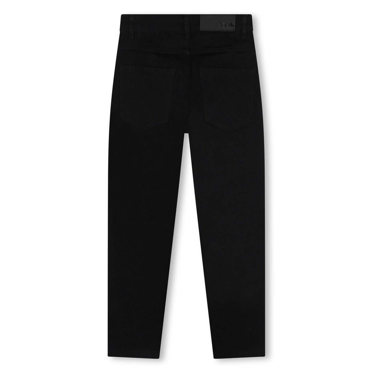 These KARL LAGERFELD KIDS jeans are a wardrobe essential. A laser-cut fade-out logo appears on the front of the left leg, while a tag with the logo appears on the back. This design is made of 99% cotton.