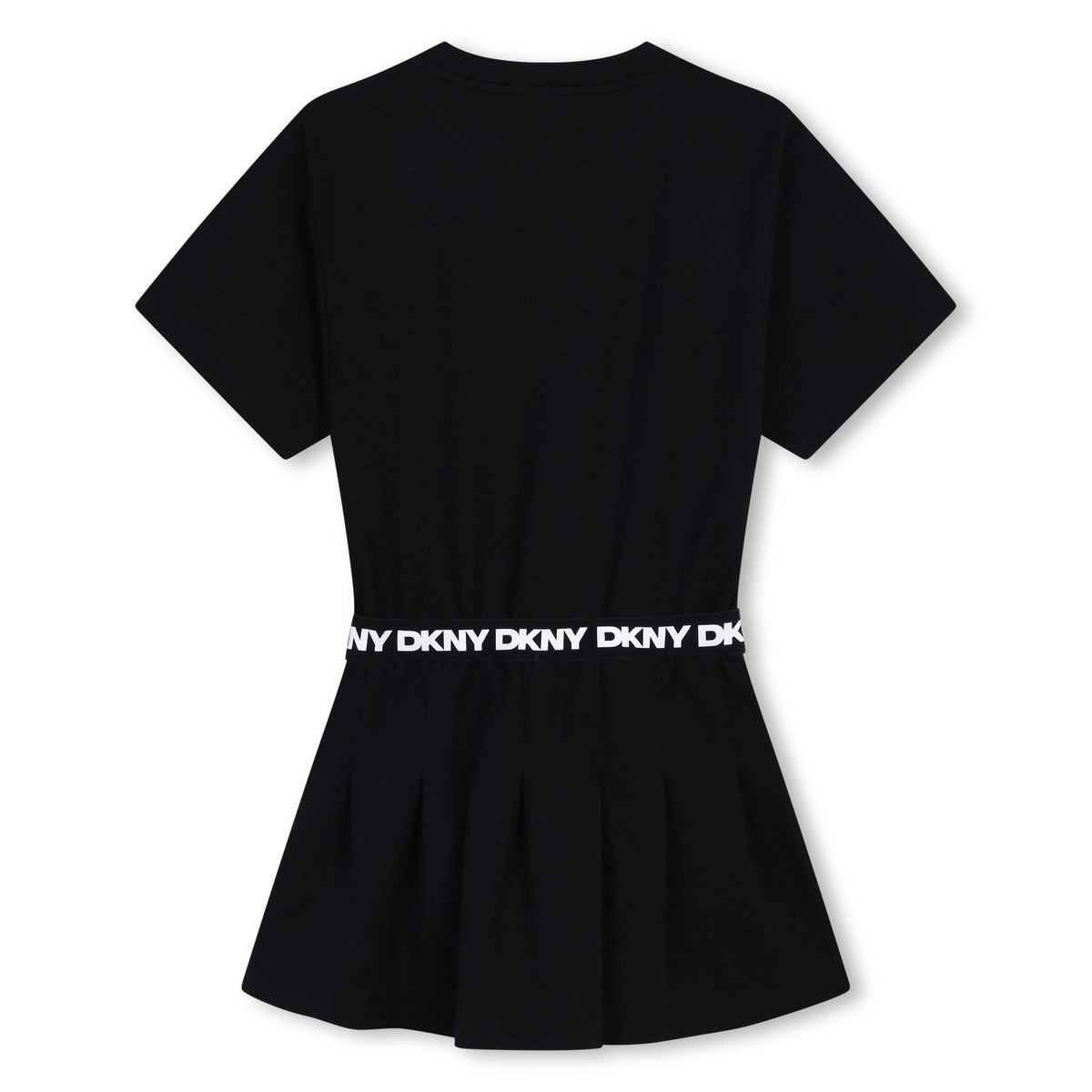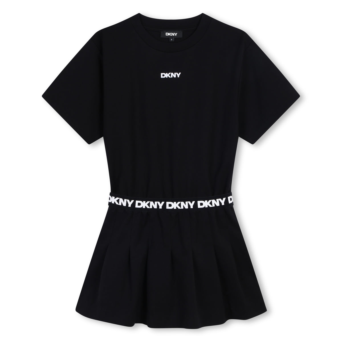 This DKNY dress comprises a short-sleeved top made with 62% viscose and a pleated skirt with an elasticated waist. The waistband features a contrasting embossed logo, while the brand logo appears on the chest.
