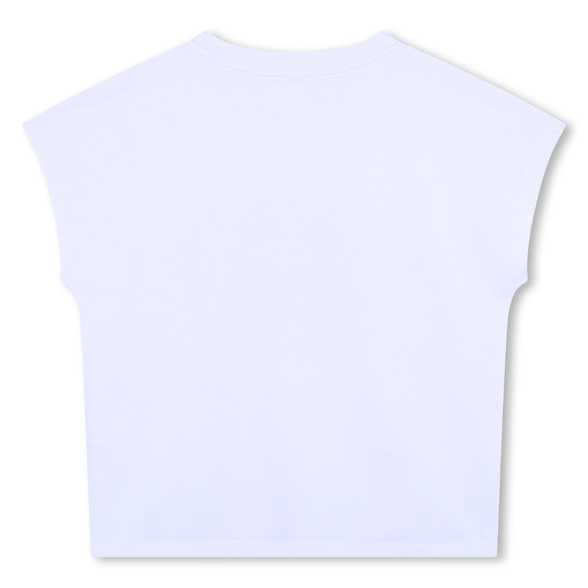This short-sleeved, round-neck DKNY T-shirt is decorated with a shiny logo on the front. It is made with 96% organic cotton and goes well with jeans for a casual outfit.