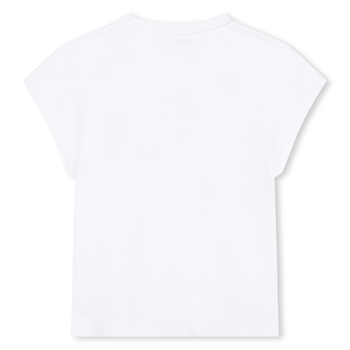 This short-sleeved, round-neck T-shirt features a DKNY logo decorated with rhinestones on the front. This 100% organic cotton garment goes well with a skirt and ankle boots.