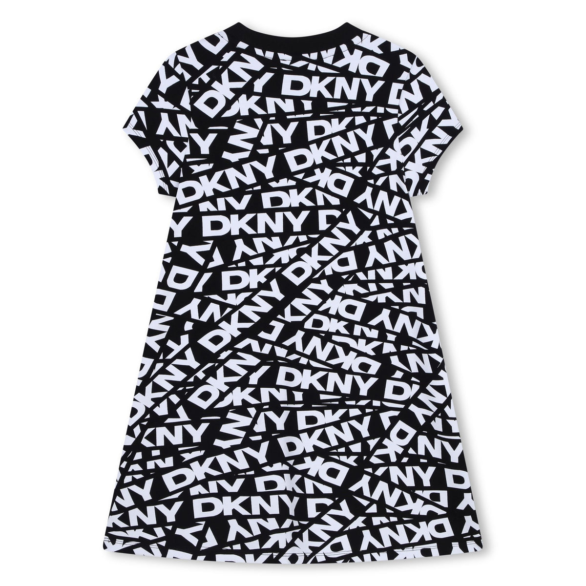 This pretty short-sleeved DKNY dress features an all-over black and white logo print. It is made with 62% viscose, with a round neckline. It goes well with ankle boots.