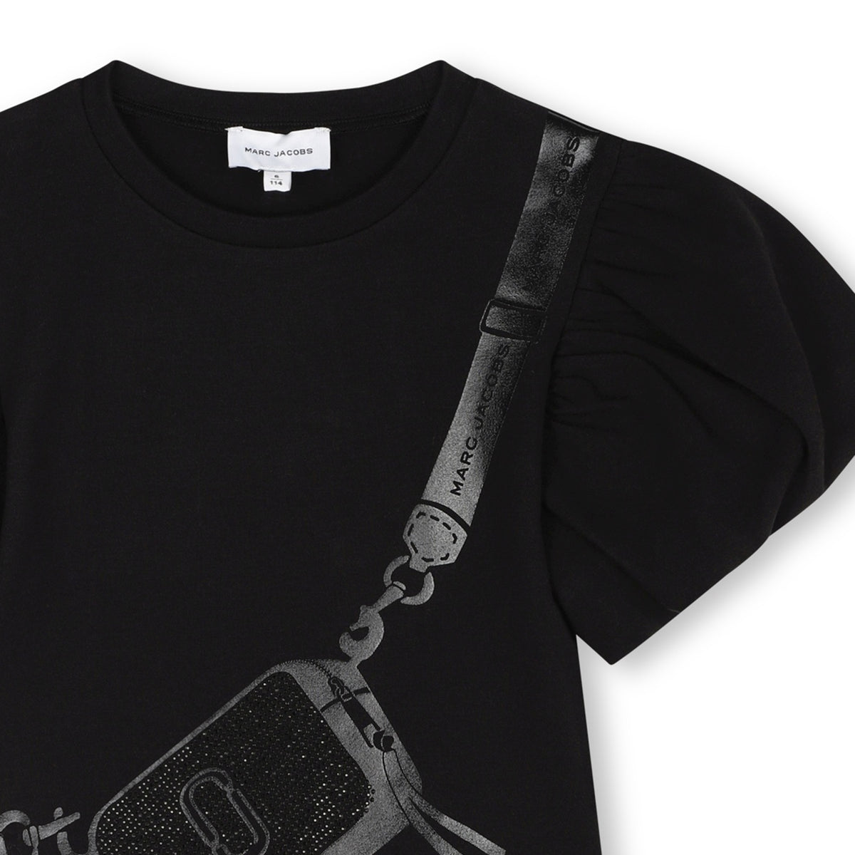 This MARC JACOBS dress combines modernity and elegance for a special occasion. It features voluminous short sleeves, a trompe l'oeil rhinestone 'Snapshot' bag illustration and a MARC JACOBS logo label. This dress is made of cotton and elastane.