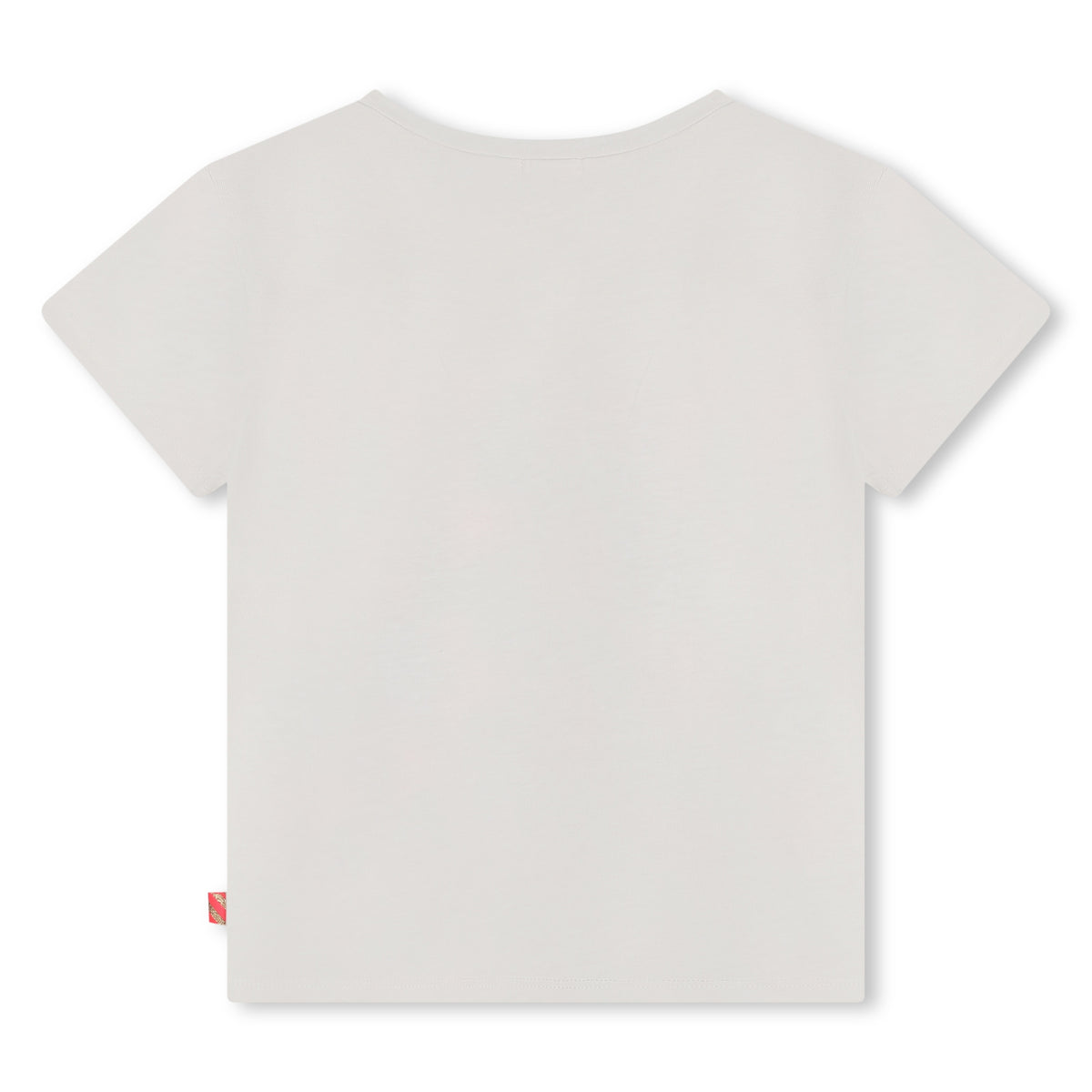 Ivory logo sequin t-shirt for girls by BILLIEBLUSH. Made from soft cotton jersey, it features a repeated brand name appliquéd with colorful sparkling sequins on the front. The shirt is detailed with a ribbed neckline and a neon pink branded tab on the side seam.