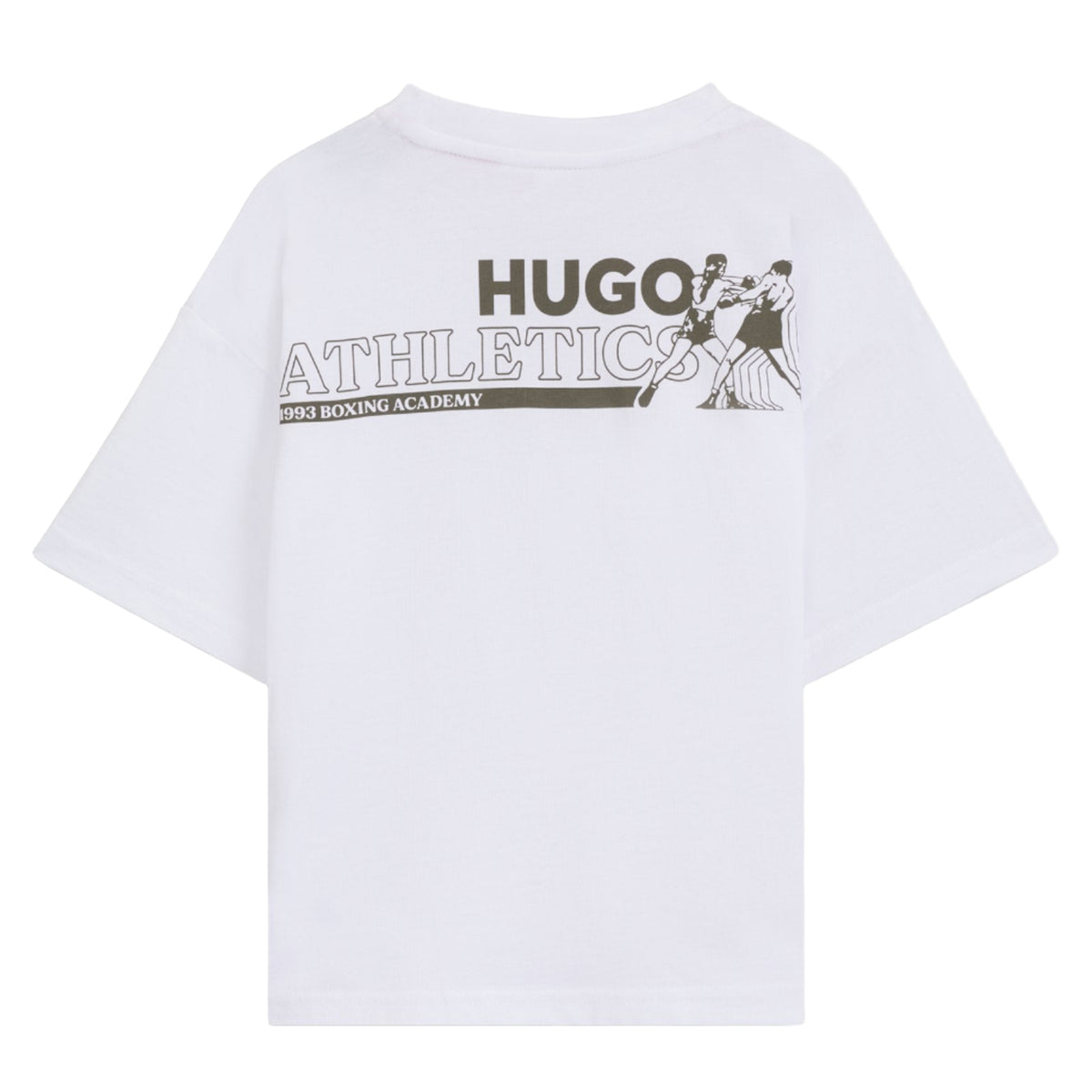 This HUGO Kids T-shirt combines style and comfort with its soft cotton fabric and bold chest logo print. The standout feature is the energetic boxing artwork on the back, adding a dynamic touch to casual outfits. Perfect for kids who want to express their personality with effortless cool.