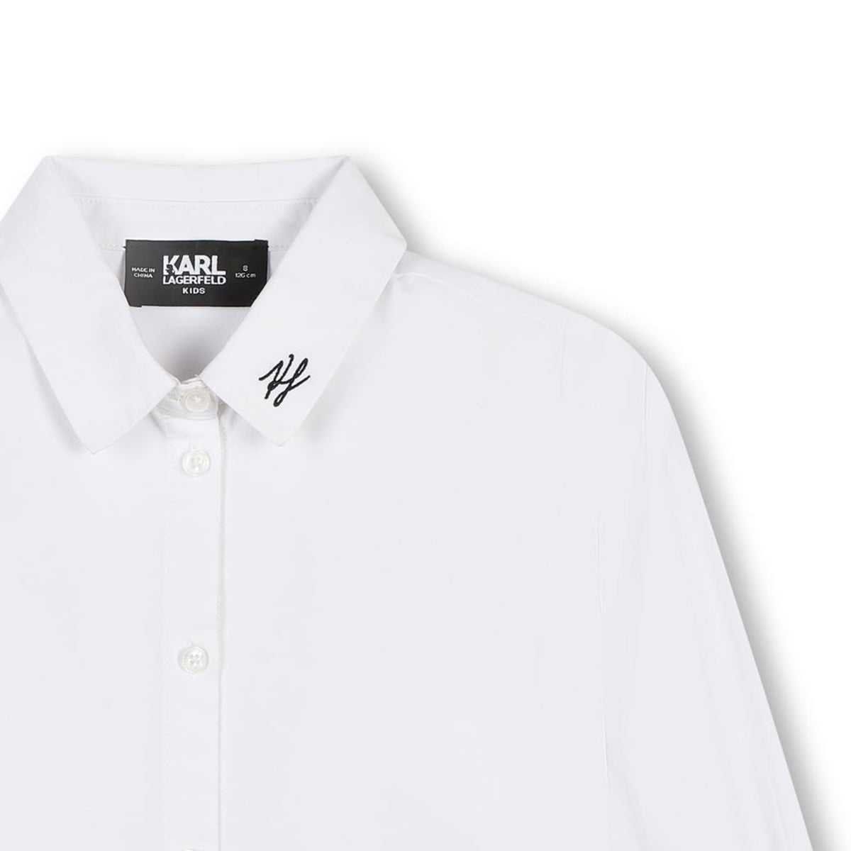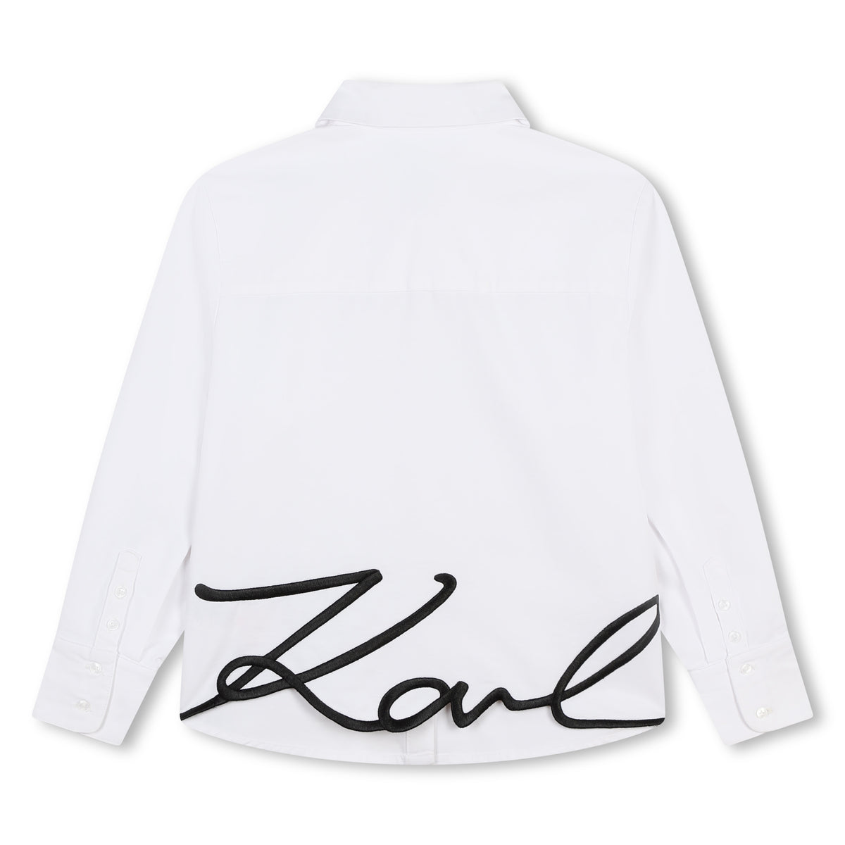 This KARL LAGERFELD KIDS shirt is an essential for elegant outfits. This design was inspired by the adult collection and features embroidered KARL SIGNATURE logos on the collar and lower back. This shirt is made of a cotton blend.